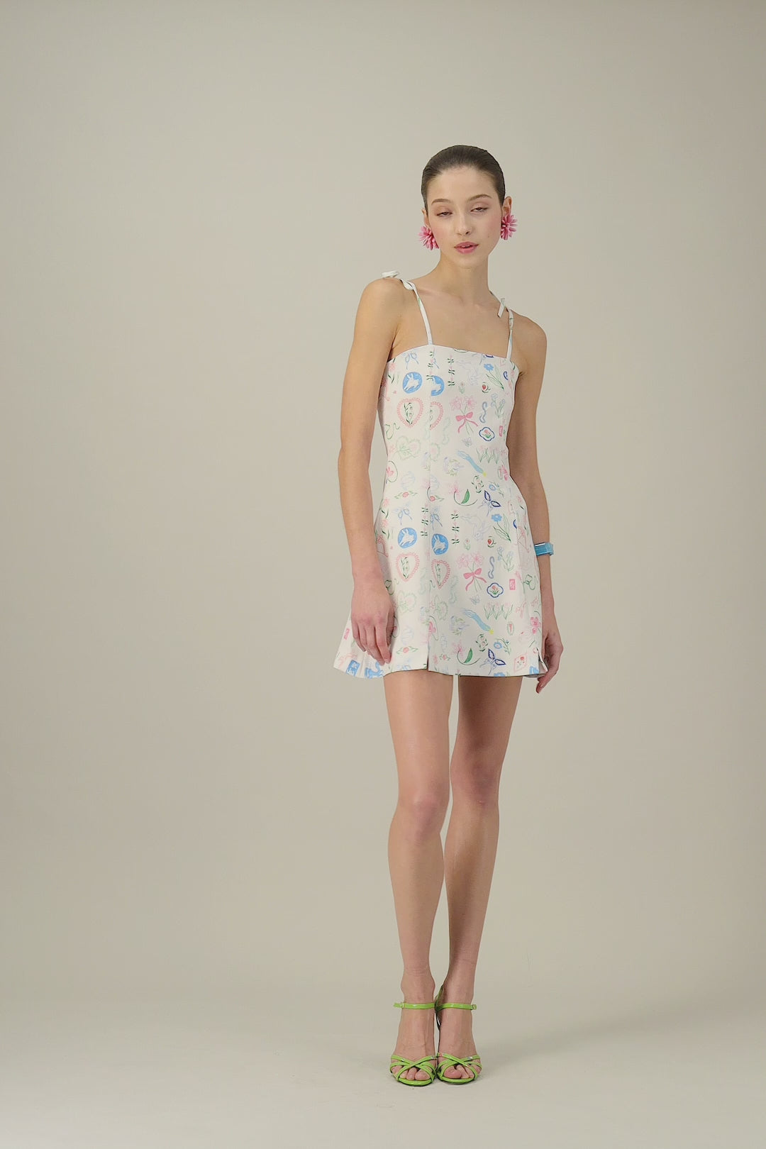 NINA, la mini-robe fraîche et pétillante : une coupe légère, des bretelles nouées et un imprimé ludique plein de charme.