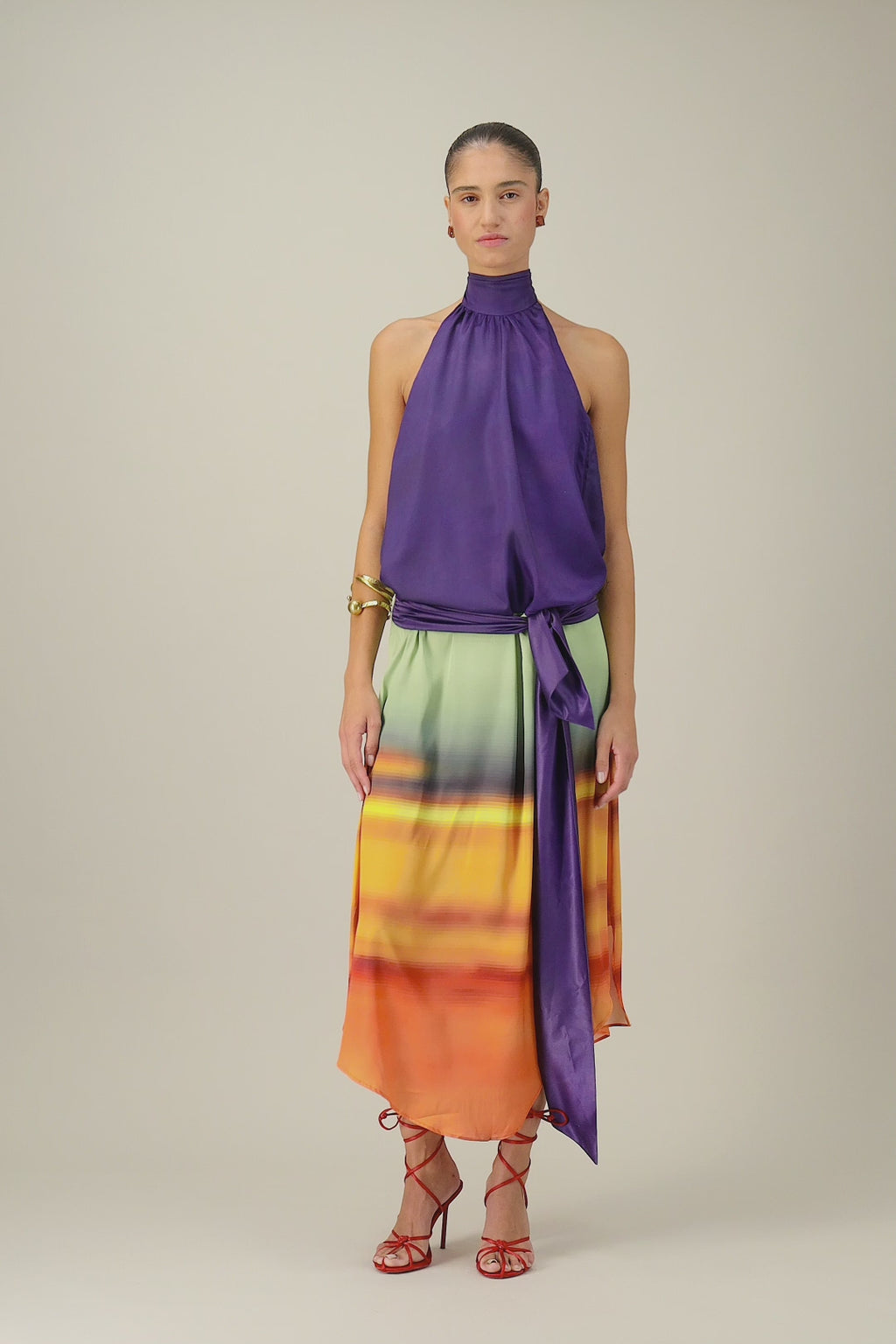 TALIA séduit par son mix audacieux : un drapé soyeux, un dos nu raffiné et un dégradé solaire.